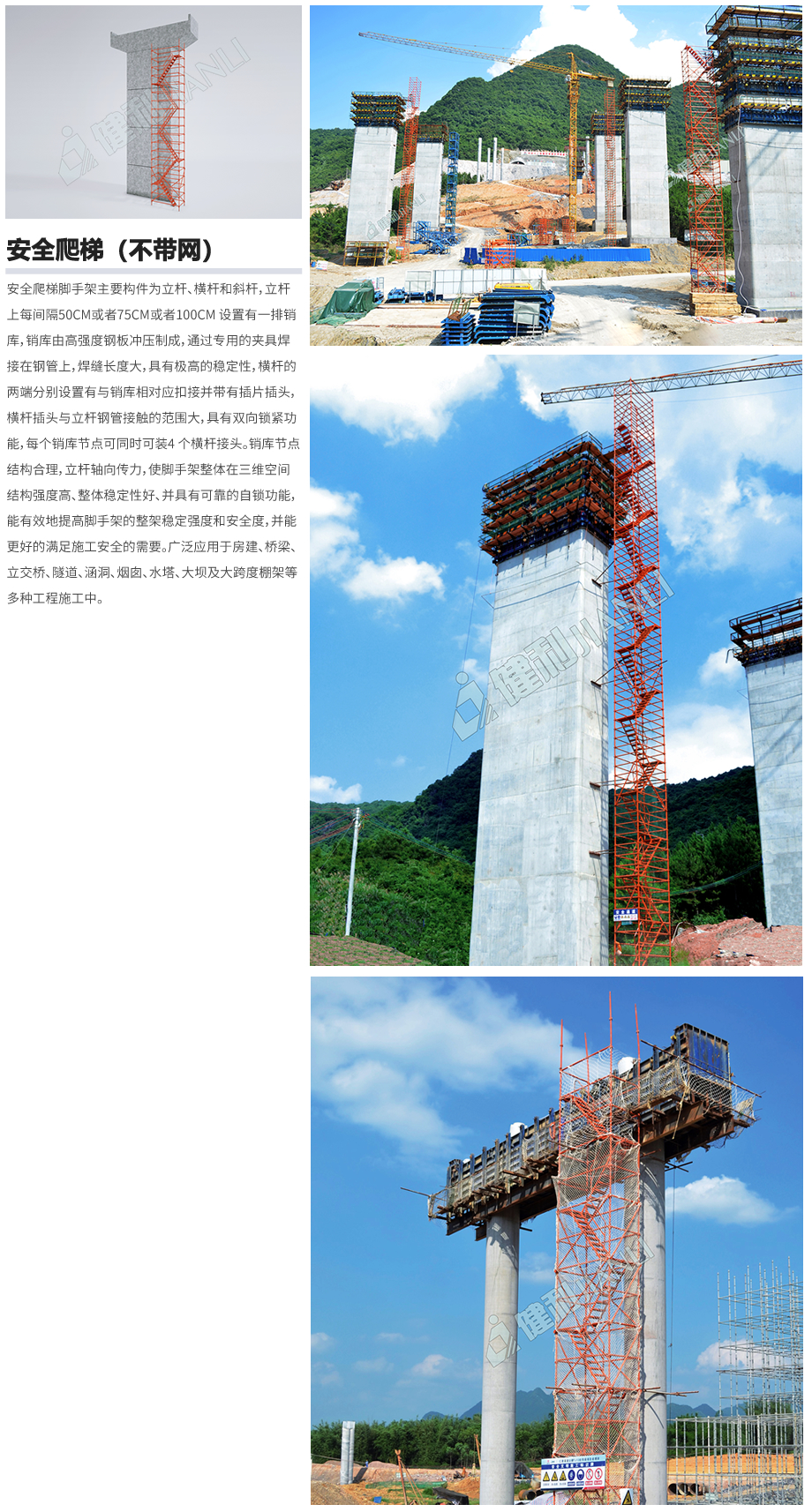 安全梯籠適用于各系列大中小型橋梁高墩施工、深基坑內(nèi)部結(jié)構(gòu)施工、水利工程施工等場景,用作建筑物基坑內(nèi)垂直上下行人通道的大型框架式爬梯。方鋼系列安全梯籠主要由平臺框架、立桿、樓梯、扶手、防護門、防護網(wǎng)等組件構(gòu)成。安全梯籠結(jié)構(gòu)強度高,整體穩(wěn)定性好,人行梯寬度合適,行人可自由錯開上下,支持懸掛使用,攜帶工具等實踐應(yīng)用,滿足各種安全施工的需要。其特征在于:現(xiàn)場安裝拆御便捷,運輸方便。安全梯籠由多個自下而上連接的爬梯單元構(gòu)成的梯架,以及連接于梯架和建筑結(jié)構(gòu)之間的固定組件組成; 每個框架內(nèi)都有配置完整的人行踏板,入口處配有方便進出的安全門,四周有安全護網(wǎng)全方位保護,可根據(jù)施工進度自行調(diào)節(jié)梯籠高度,是建筑施工單位的首選工具。